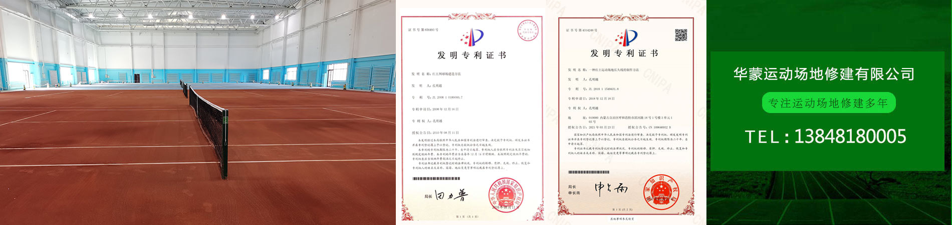 "紅土網球場地建造方法”獲得了實用專利技術證書,解決了紅土場地長畫線及畫線難的問題;產品綠色環保——通過權威認證機構無毒環保檢驗。